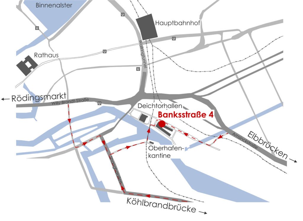 ÖPNV: U-Bahn-Haltestelle Steinstraße oder Meßberg (Linie U1), 5 min Fußweg an den Deichtorhallen vorbei zur Banksstraße.